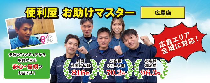 この度は便利屋お助けマスター広島店にご来店いただきまして誠にありがとうございます。当社では「格安」を売りにしているわけでは無く、決して大手の便利屋さんでもありません。しかし、そんな中当社をお選びいただけたお客様には必ず「選んでよかった」 と言っていただけるサービスのご提供をお約束いたします。
