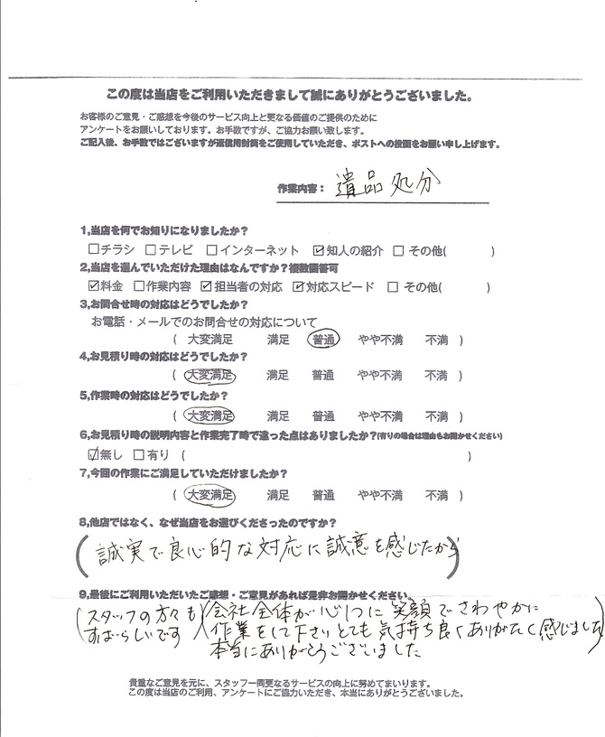 50代女性:遺品整理なんとかしたいと長年思っていた実家の遺品整理を依頼しました。丁寧に対応してくださったので、見積だけお願いしようと思っていたのに、そのまま即決して作業してもらいました。今後も何かあればお願いしたいと思います。